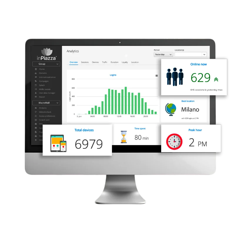 • Analytics WiFi avanzati per comprendere il comportamento dei clienti, prendere decisioni informate e attivare campagne più mirate.